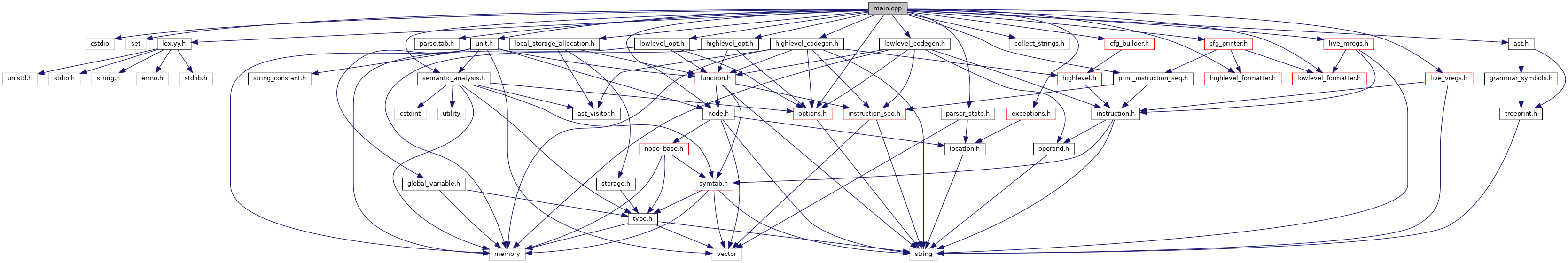 #include <cstdio>#include <set>#include "node.h"#include "ast.h"#include "parse.tab.h"#include "lex.yy.h"#include "parser_state.h"#include "unit.h"#include "semantic_analysis.h"#include "local_storage_allocation.h"#include "highlevel_codegen.h"#include "lowlevel_codegen.h"#include "highlevel_opt.h"#include "lowlevel_opt.h"#include "collect_strings.h"#include "highlevel_formatter.h"#include "lowlevel_formatter.h"#include "print_instruction_seq.h"#include "cfg_builder.h"#include "cfg_printer.h"#include "live_vregs.h"#include "live_mregs.h"#include "exceptions.h"#include "options.h"